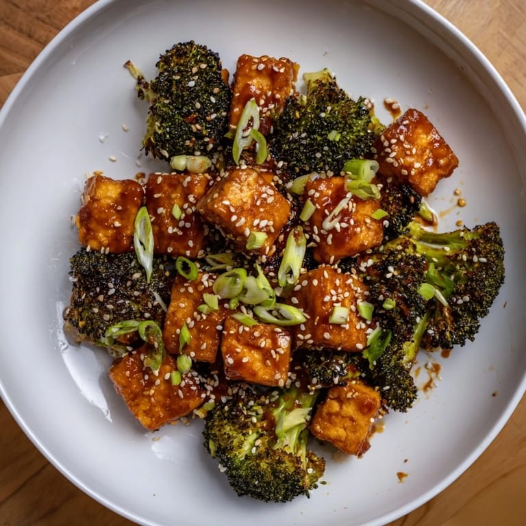 Save A vibrant, plant-based dish featuring golden, crispy tofu and tender broccoli, all roasted on a single sheet pan and drizzled with a tangy sesame-chili sauce. Perfect for a healthy weeknight dinner.