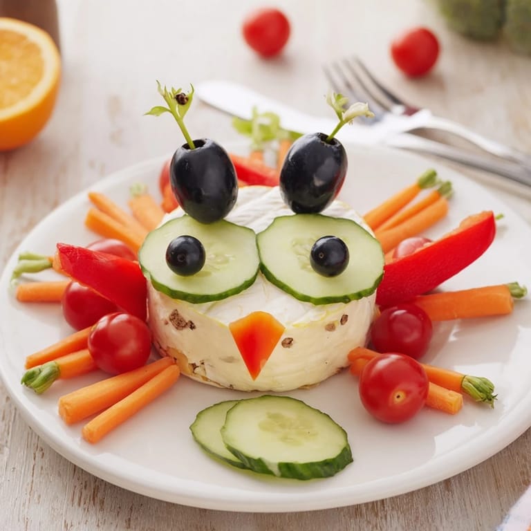 - Arrange cherry tomatoes, carrot sticks, and cucumber slices around the cheese to resemble grass and flowers.