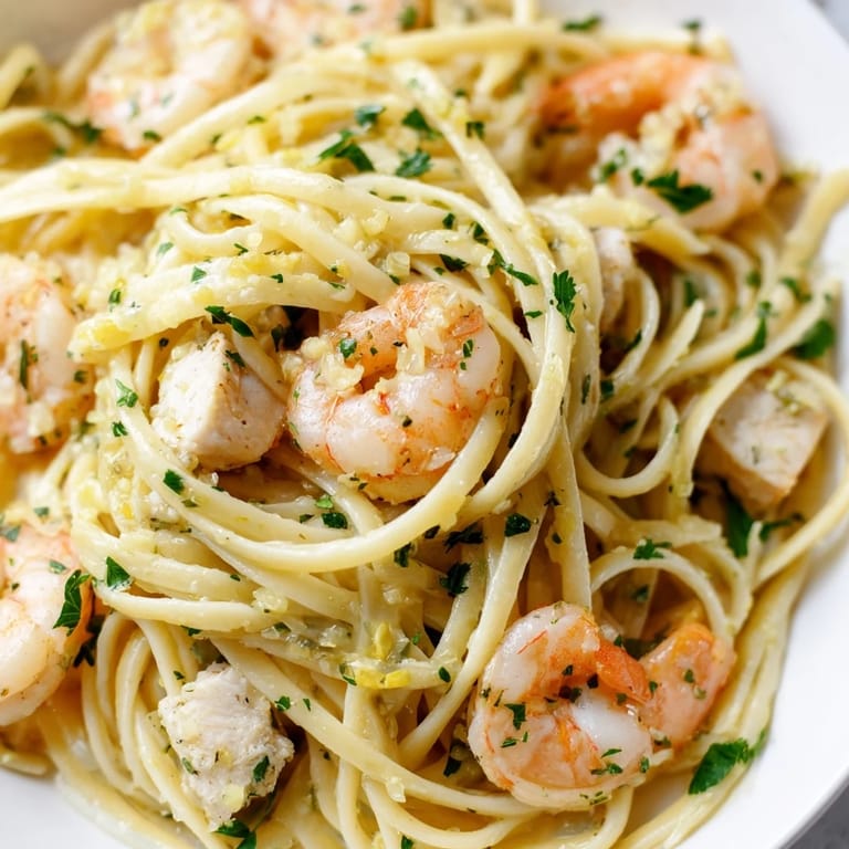 Save Last Friday, my husband called from work to say his sister was unexpectedly in town and staying for dinner. I stared at our empty fridge, then remembered the shrimp and chicken I had tucked away after grocery shopping two days before. Within thirty minutes, this lemon garlic pasta was bubbling on the stove, and the three of us were laughing around the table like nothing about the evening had been unplanned at all.