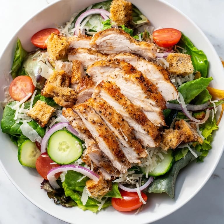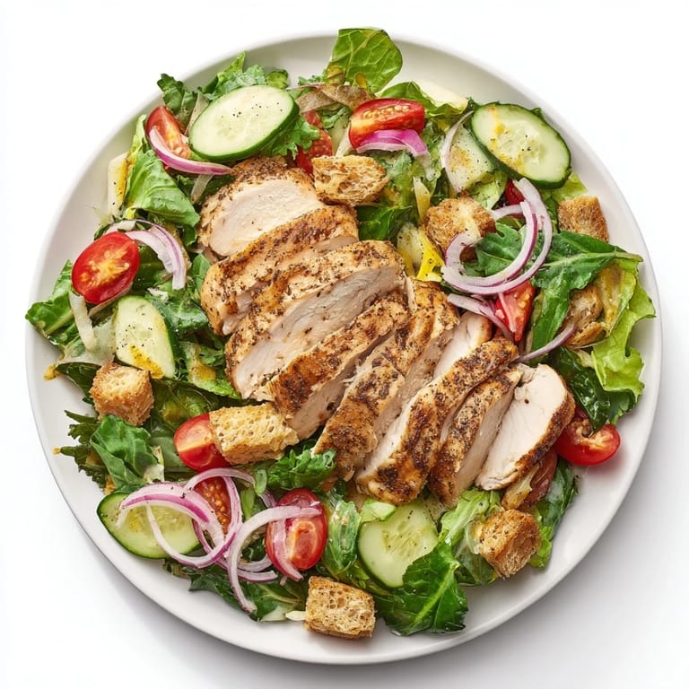 Save A vibrant, refreshing salad featuring crisp greens, juicy chicken, crunchy croutons, and a zesty lemon-Parmesan dressing—perfect for a speedy, satisfying lunch or light dinner.