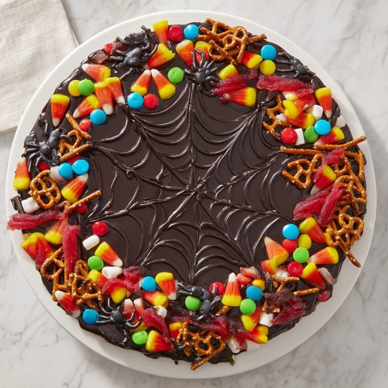 Save A fun and spooky candy platter arranged in the shape of a spiderweb, perfect for Halloween parties or themed gatherings. This treat features a mix of candies with a dramatic chocolate spiderweb centerpiece.