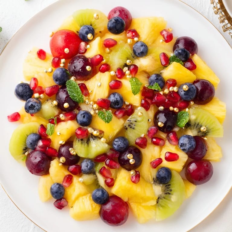Save A vibrant and festive fruit platter inspired by the Epiphany tradition, featuring a regal selection of fresh fruits, honey-lime dressing, and a sprinkle of mint for a majestic touch.